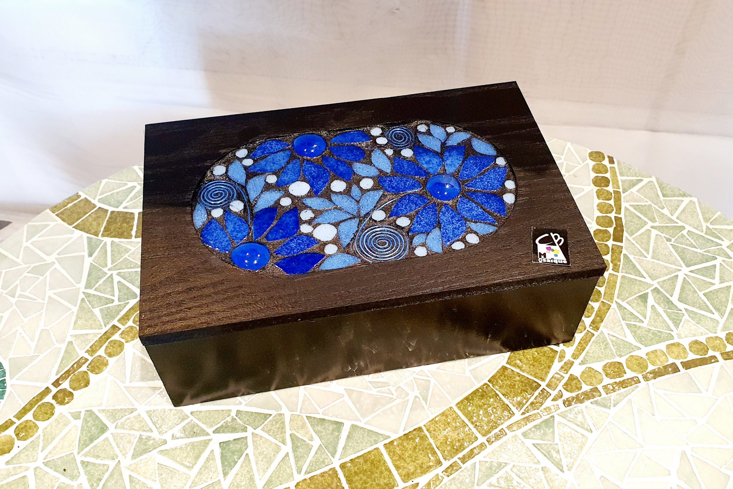 Boite à thé Mosaïque végétal bleu, joint noir. mélange de matières, en émaux de Briare, pate de verre, vernis protecteur .