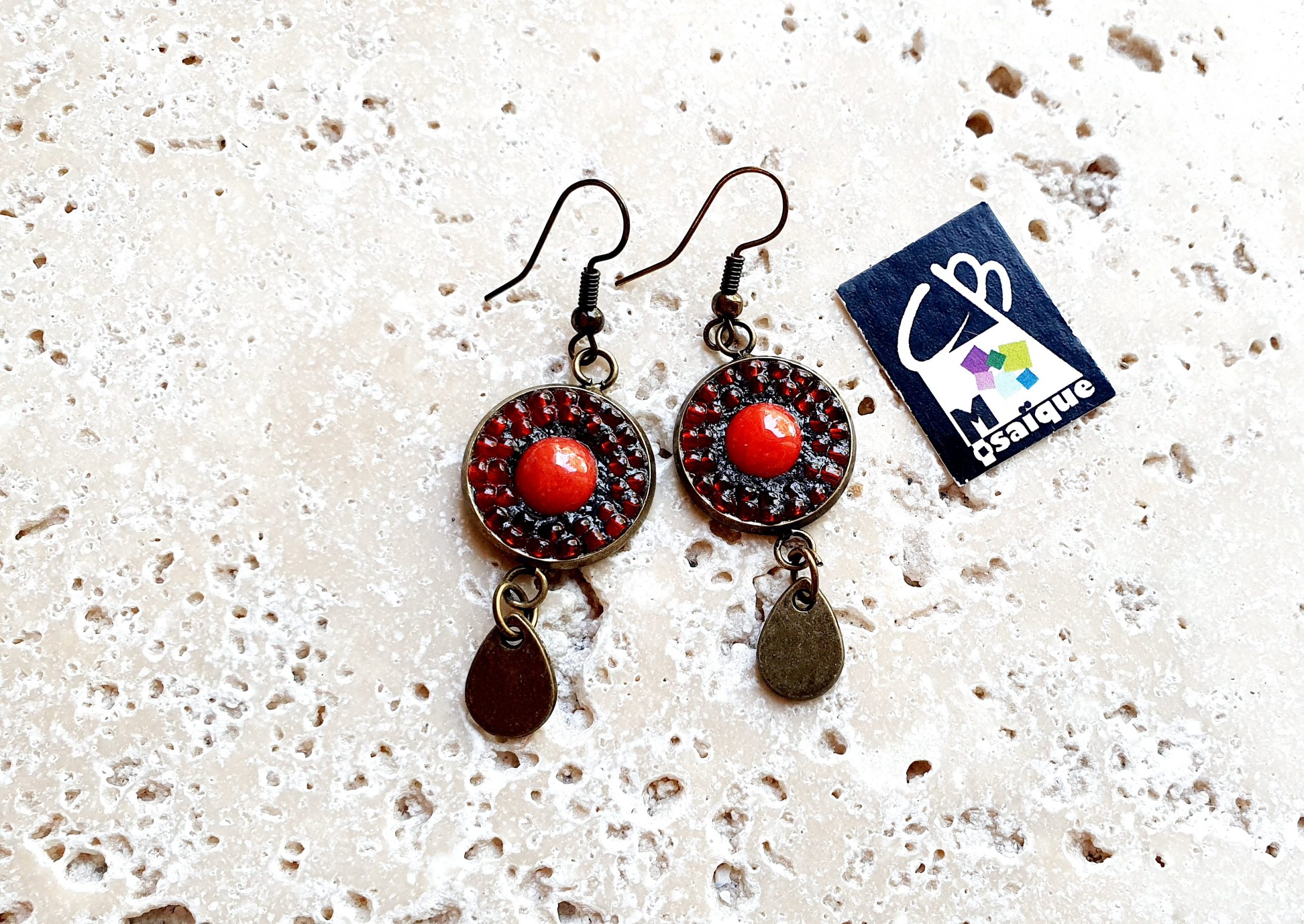 Boucles d’oreilles ronde rouge en verre et rocaille en mosaïque, avec pampilles gouttes, supports couleur bronze, joint noir et vernis protecteur.