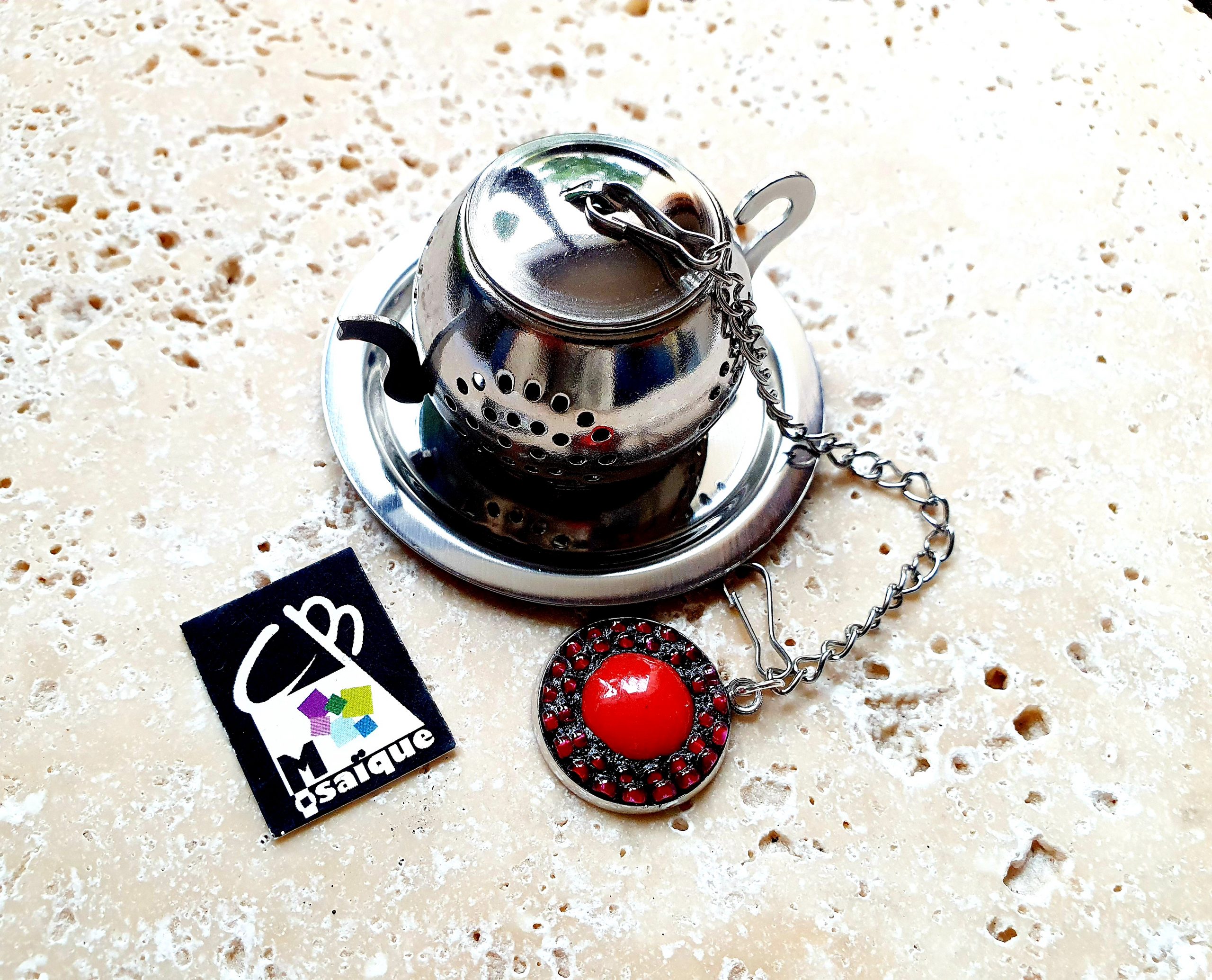Boule à thé Théière médaillon en mosaïque de verre rouge et pate de verre, joint noir. Vernis protecteur.
