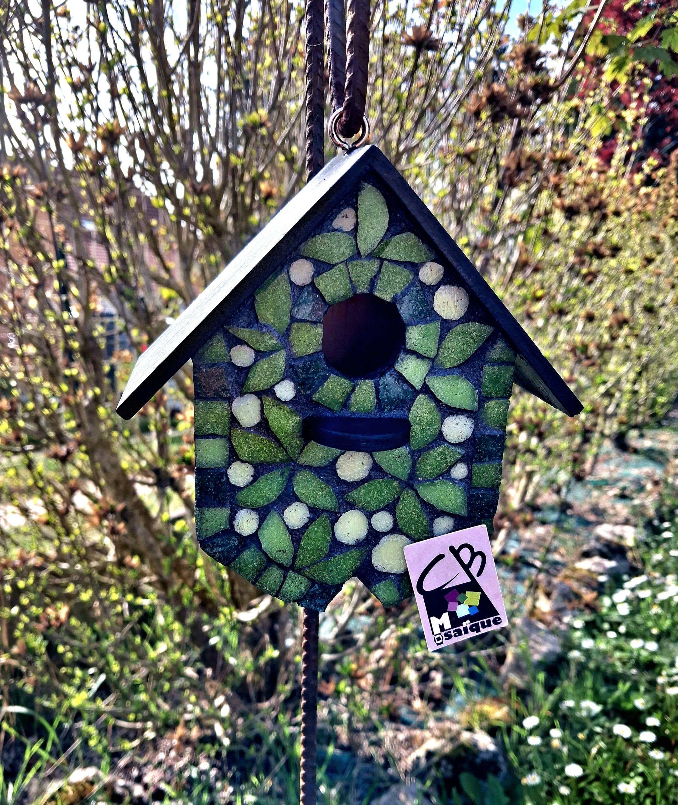 Nichoir oiseaux Végétal vert en mosaïque, émaux de Briare, pate de verre,